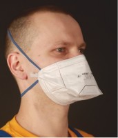 Компактный респиратор, уникального двойного сложения из нетканого фильтрующего материала, имеющий эластичные ленты оголовья и носовой зажим.